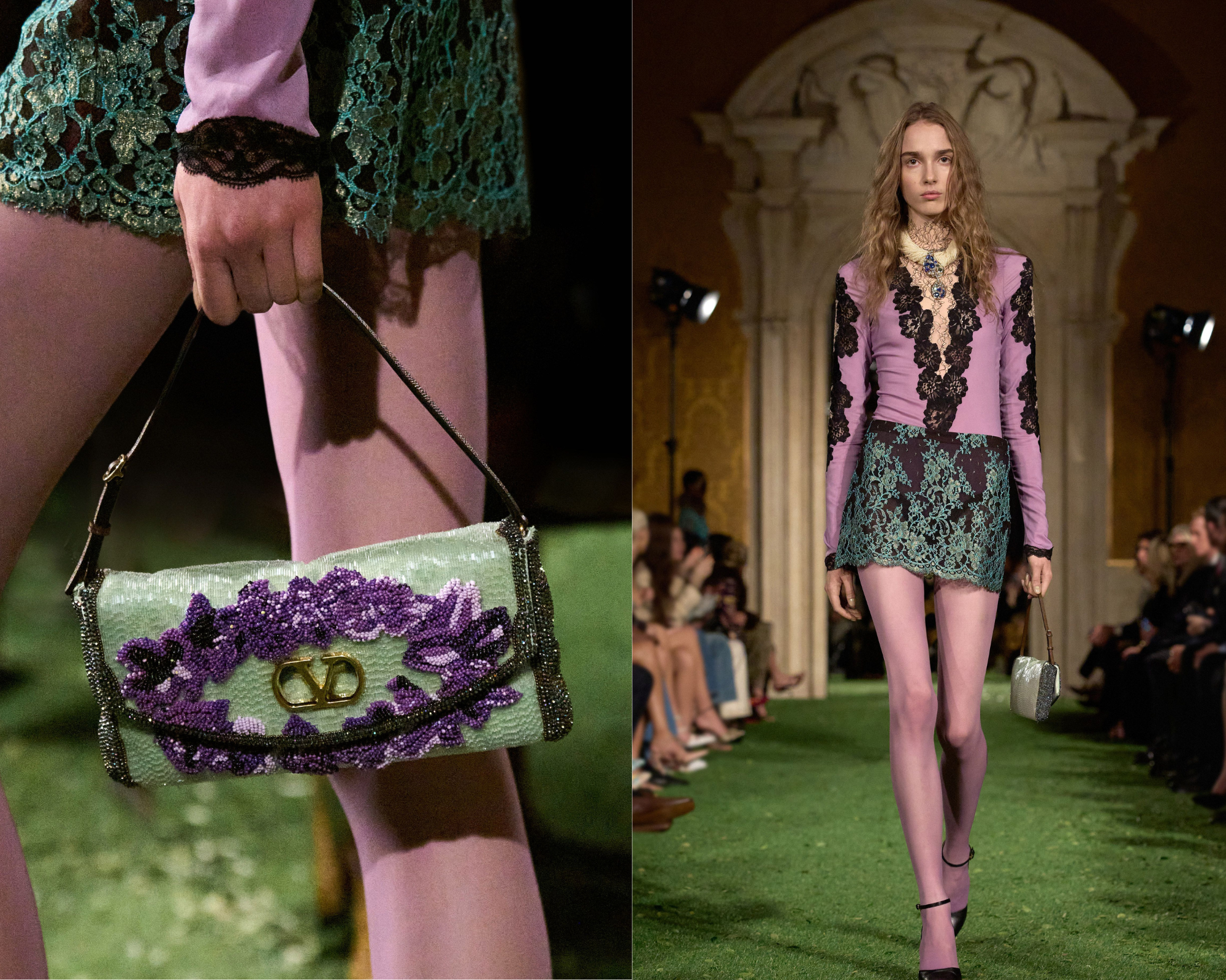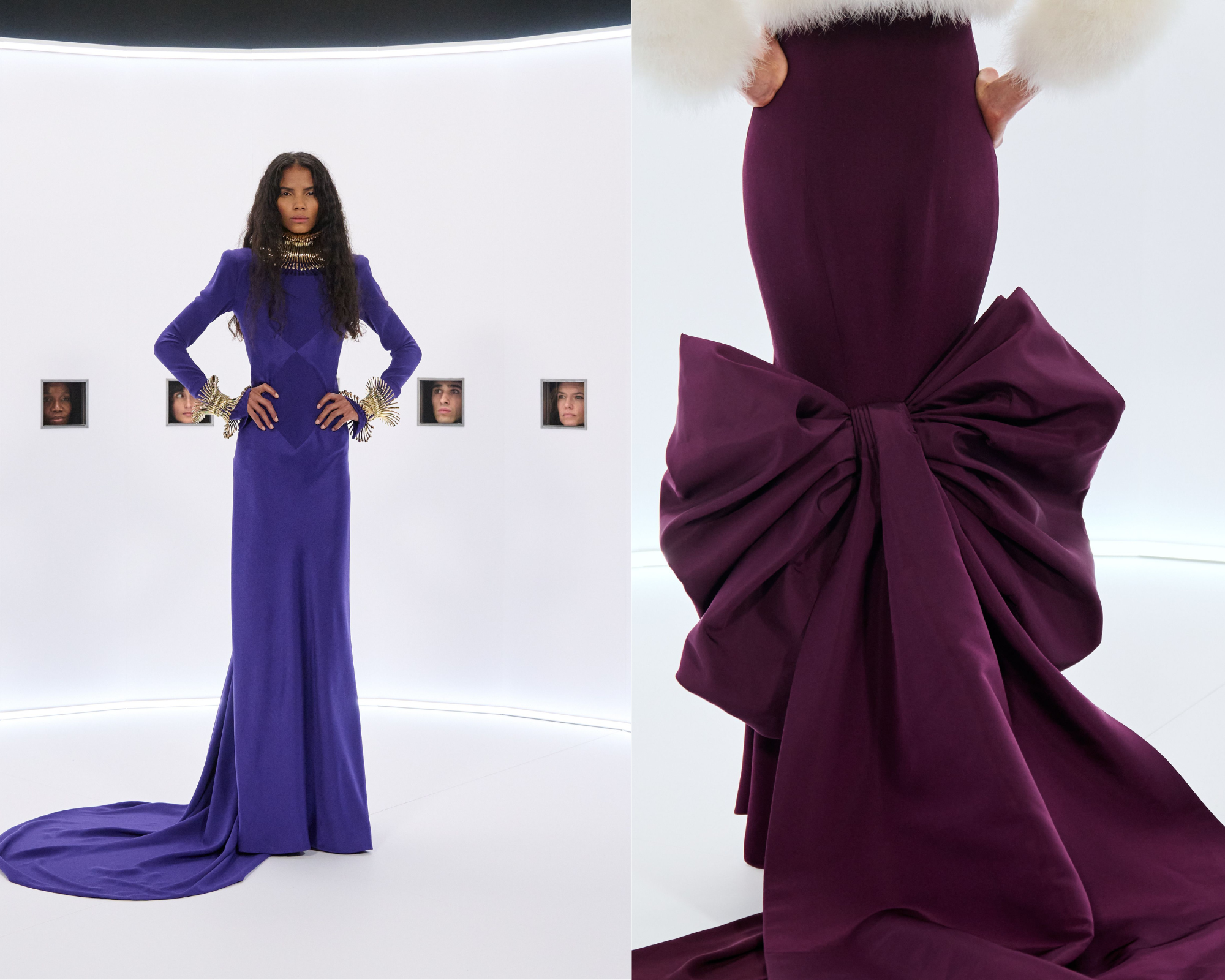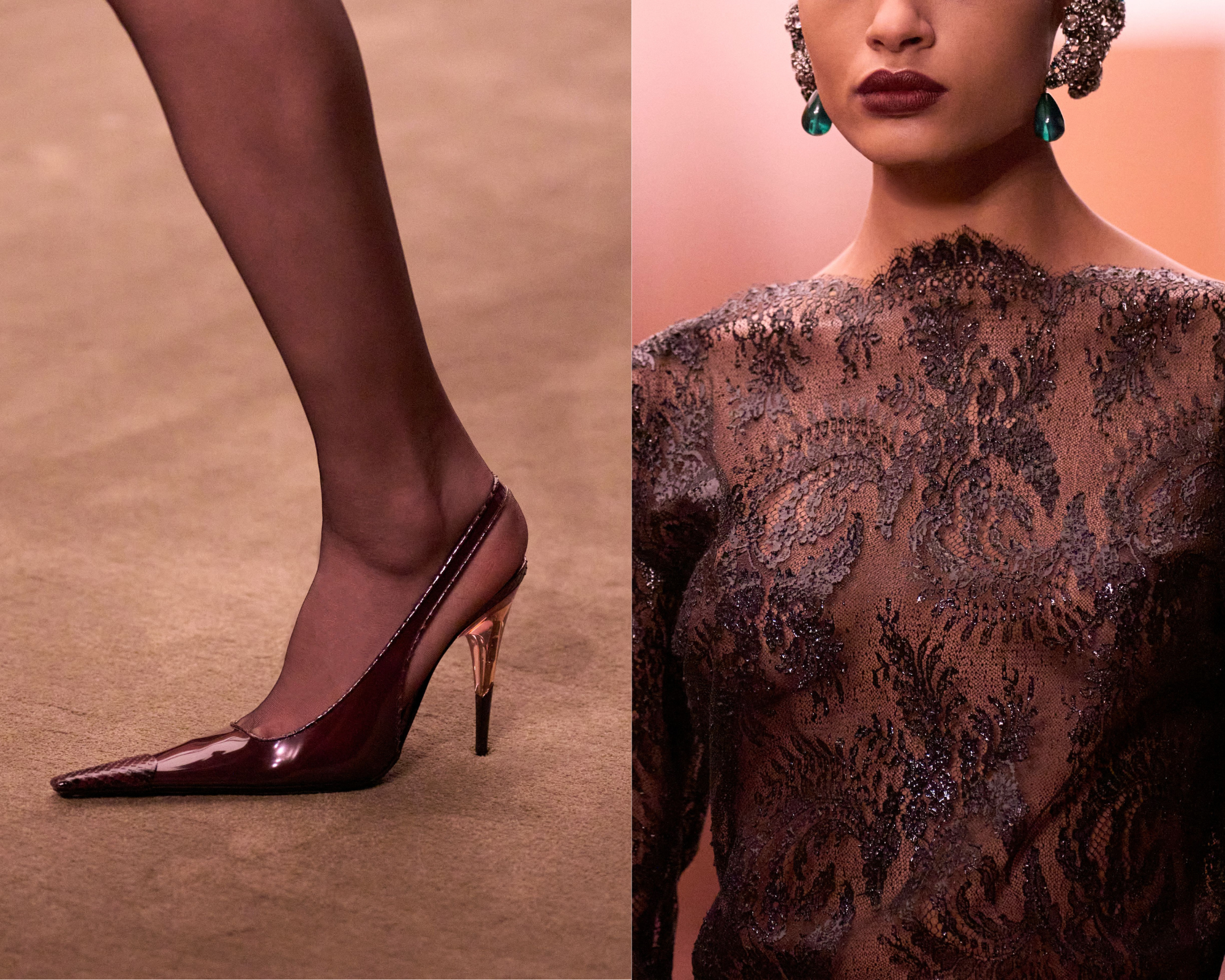 Οι αποχρώσεις του —από το απαλό λιλά μέχρι το βαθύ δαμασκηνί— κυριαρχούν σε υφάσματα, λεπτομέρειες, δαντέλες και total looks, δημιουργώντας εικόνες που συνδυάζουν πολυτέλεια και τόλμη.