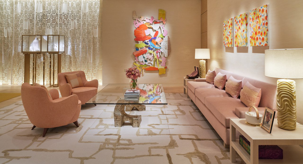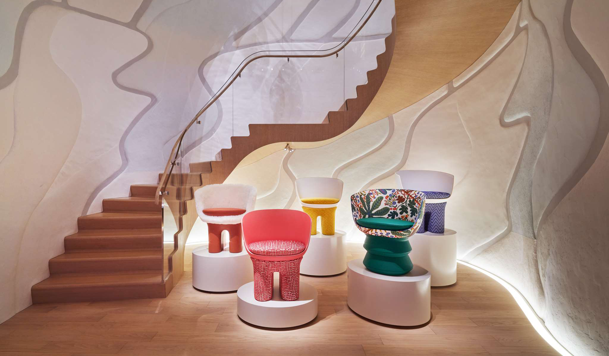 Κάθε όροφος έχει μια διαφορετική ατμόσφαιρα: οι χώροι των γυναικείων συλλογών αναπτύσσονται με απαλά ροζ, πορτοκαλί και θερμά χρώματα, ενώ οι χώροι των ανδρικών συλλογών χρησιμοποιούν πιο βαθιές αποχρώσεις, όπως κόκκινο, τυρκουάζ και πράσινο, ενσωματώνοντας επίπλωση από σχεδιαστές όπως ο Isamu Noguchi και ο Morten Stenbaek.