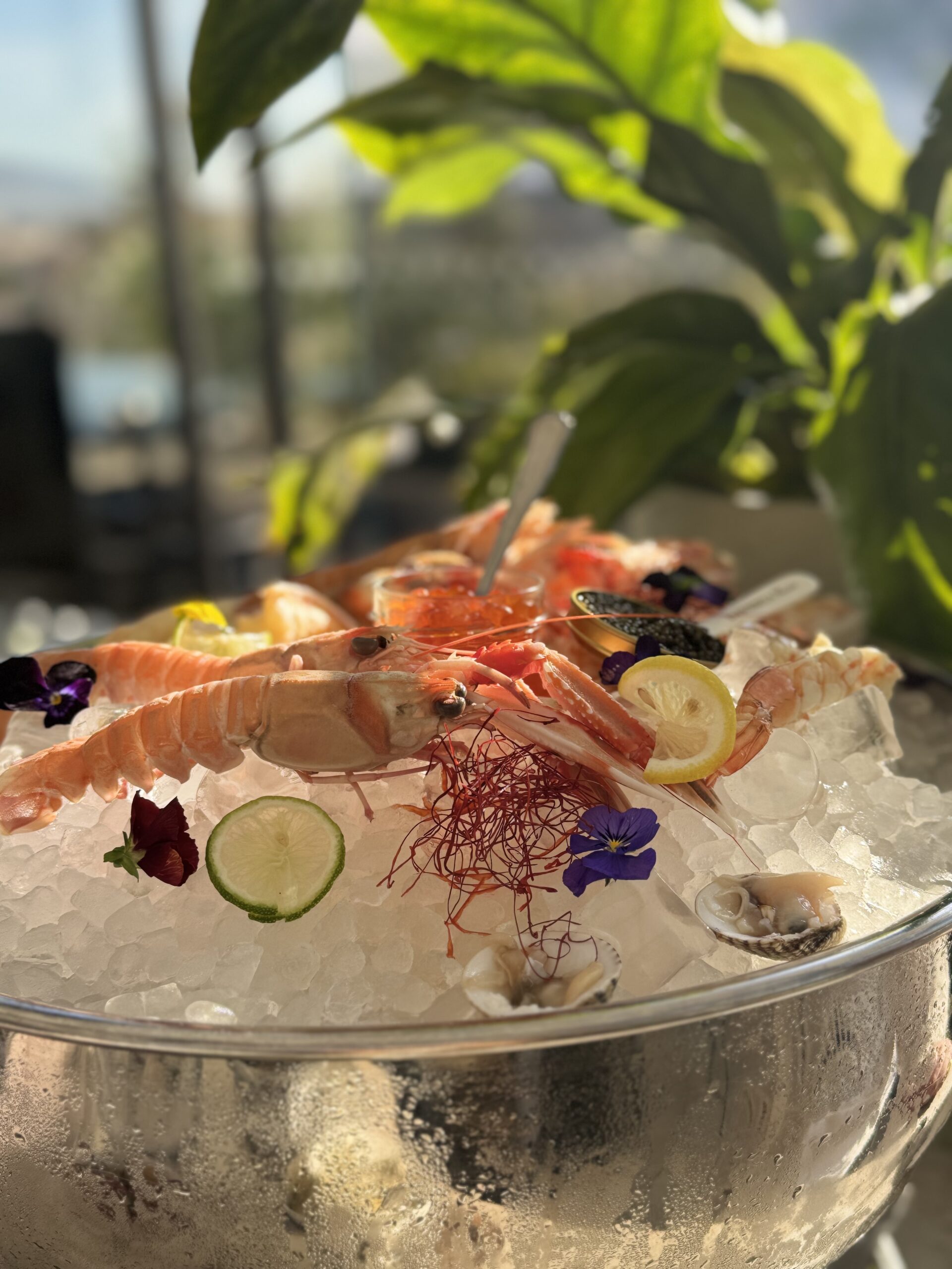 Στη μαρμάρινη επιφάνεια του μπαρ, σαν μια συνέχεια των κιόνων, απλώνεται ένας γαστρονομικός πίνακας. Ο εκλεπτυσμένος μπουφές συνδυάζει φρέσκα ψαρικά, πλούσιες σαλάτες και μεσογειακά πιάτα με μια δόση ανατολής. Αναδύει αρώματα από κύμινο, εσπεριδοειδή και φρεσκοψημένο ψωμί.