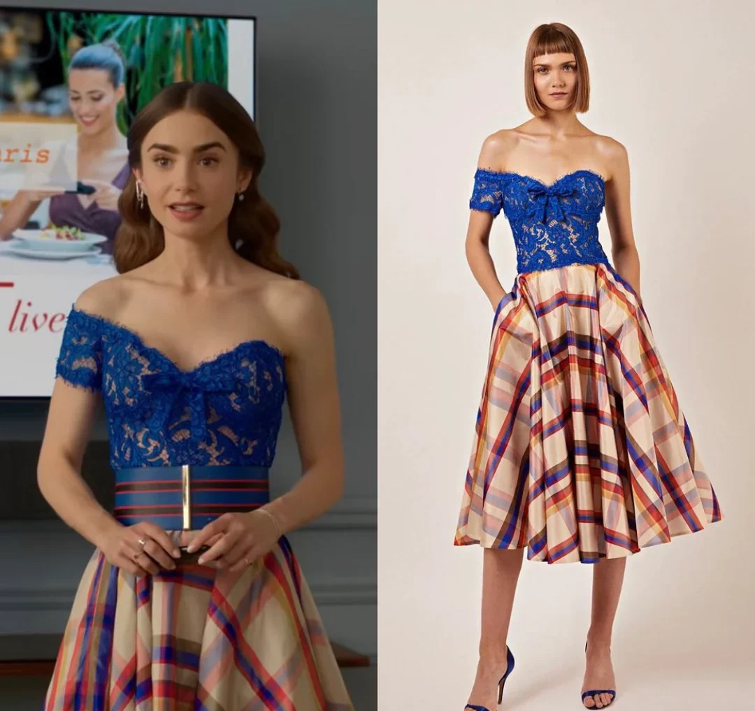 Το Patricia dress συμπληρώνεται από καρό μίντι φούστα σε γραμμή άλφα. Κάθε εμφάνιση της Emily αποπνέει θηλυκότητα, αυτοπεποίθηση, κινηματογραφική κομψότητα, ταυτόχρονα όμως και κάποια σύγχυση καθώς η ηρωίδα ανακαλύπτει τον εαυτό της. Τα look της σίγουρα μεταφέρουν στον θεατή την αυθεντική προσωπικότητά της.