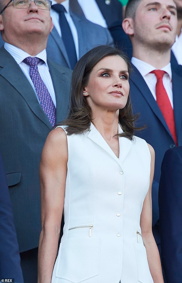 Η λαμπερή και κομψή βασίλισσα της Ισπανίας τράβηξε όλα τα βλέμματα πάνω της, καθώς παρέδωσε το κύπελλο στη νικήτρια ομάδα. Για την περίσταση, επέλεξε ένα λευκό ανοιξιάτικο γιλέκο χωρίς μανίκια με χρυσά κουμπιά και χρυσό φερμουάρ, με διαφάνεια στην πλάτη.