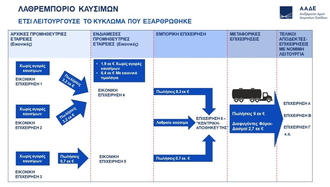 Ένα πολυμελές και καλά οργανωμένο δίκτυο εταιρειών-βιτρινών, που διοχέτευε, συστηματικά, λαθραία καύσιμα στην αγορά, έφεραν στο φως οι ελεγκτές της Ανεξάρτητης Αρχής Δημοσίων Εσόδων (ΑΑΔΕ).