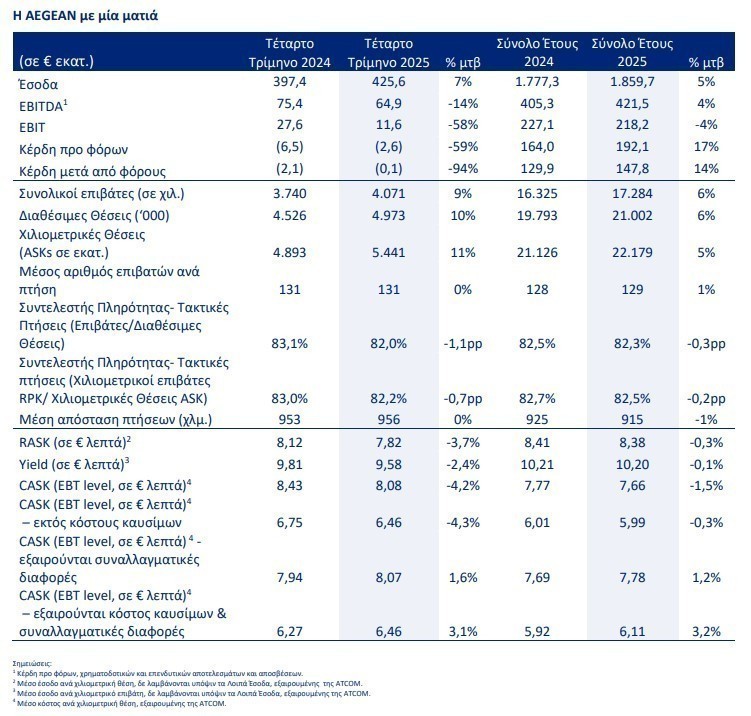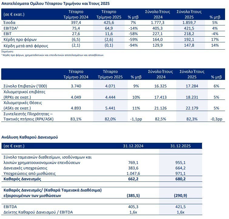 Κατά το τέταρτο τρίμηνο του 2025, ο Όμιλος συνέχισε την στρατηγική ενίσχυσης της χειμερινής δραστηριότητας, αυξάνοντας τις διαθέσιμες θέσεις κατά 10% και μετέφερε 9% περισσότερους επιβάτες, επιβεβαιώνοντας τη σταδιακή ενίσχυση της ζήτησης και στους παραδοσιακά πιο αδύναμους μήνες του έτους. Ο κύκλος εργασιών του τελευταίου τριμήνου αυξήθηκε κατά 7%.