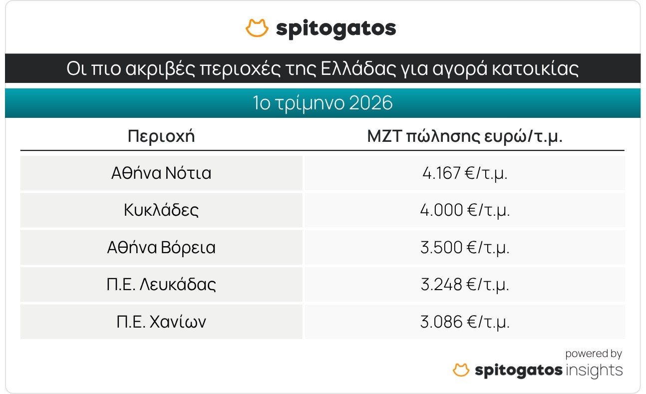 Τα Νότια Προάστια και οι Κυκλάδες συνεχίζουν να καταλαμβάνουν τις πρώτες θέσεις στην κατάταξη των πιο ακριβών περιοχών της χώρας για αγορά κατοικίας, με ΜΖΤ πώλησης κατοικίας 4.167 ευρώ/τ.μ. και 4.000 ευρώ/τ.μ. αντίστοιχα, ενώ ακολουθούν τα Βόρεια Προάστια, η Περιφερειακή Ενότητα (Π.Ε.) Λευκάδας και η Π.Ε. Χανίων.