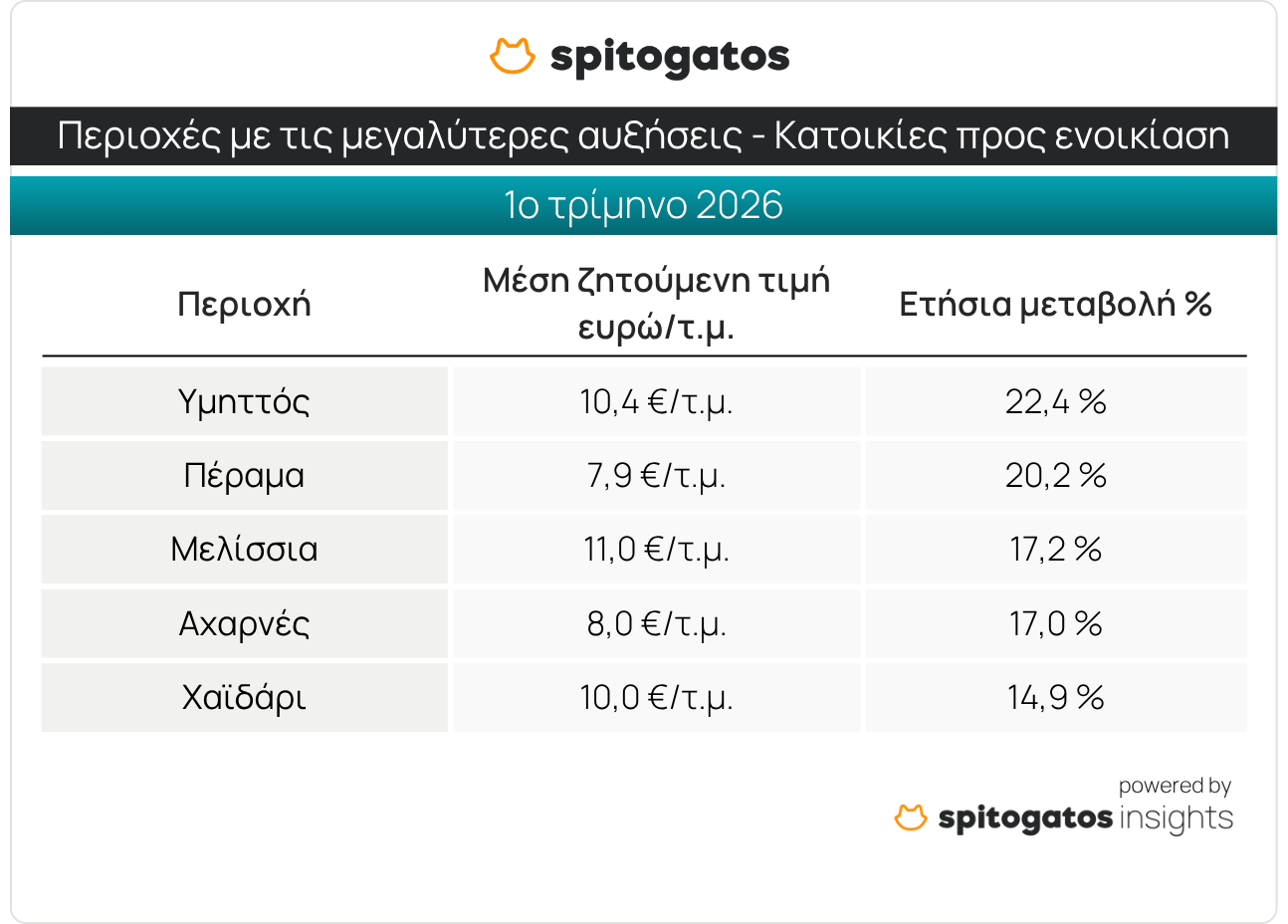 Οι σημαντικές ετήσιες αυξήσεις που σημειώνονται στις ζητούμενες τιμές πώλησης σε Ταύρο και Δάφνη, καθώς και στις ζητούμενες τιμές ενοικίασης σε Πέραμα, Αχαρνές και Χαϊδάρι, υπογραμμίζουν το αυξανόμενο ενδιαφέρον αυτών που αναζητούν κατοικία — είτε προς πώληση είτε προς ενοικίαση — σε λιγότερο δημοφιλείς αλλά πιο οικονομικά προσιτές περιοχές.
