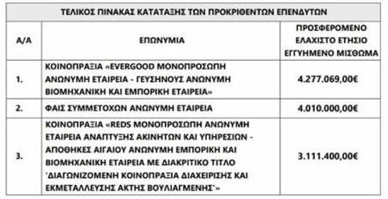 Με βάση τα αποτελέσματα των οικονομικών προσφορών, πλειοδότης αναδείχθηκε η κοινοπραξία Evergood Μονοπρόσωπη Α.Ε. – Γευσήνους Α.Ε.Β.Ε., η οποία κατέθεσε τίμημα ύψους 4.277.069 ευρώ.