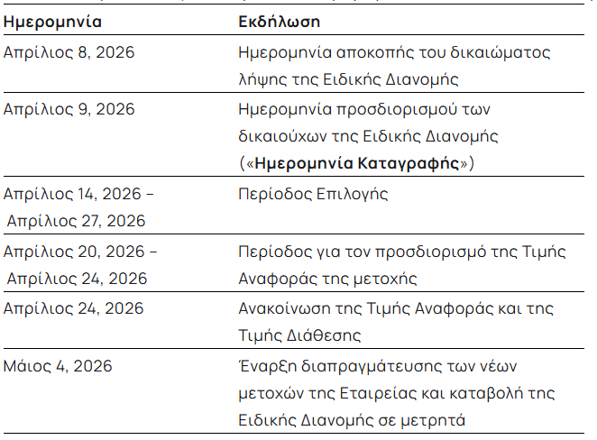 Η καταβολή της Ειδικής Διανομής και η εισαγωγή προς διαπραγμάτευση των Νέων Μετοχών αναμένεται να πραγματοποιηθούν την ίδια ημερομηνία, η οποία αναμένεται να είναι [Δευτέρα, 4 Μαΐου 2026].