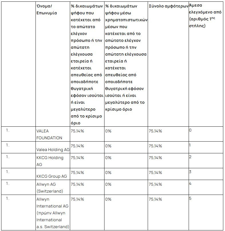 και κατόπιν συνυπολογισμού των ως άνω συναλλαγών, το VALEAFOUNDATION κατέχει έμμεσα (μέσω των ελεγχόμενων προσώπων που παρατίθενται στον κάτωθι πίνακα) 604.392.847 δικαιώματα ψήφου της Εταιρείας με ημερομηνία αναφοράς την 24 Μαρτίου 2026, τα οποία αντιστοιχούν σε ισάριθμες κοινές μετοχές, ήτοι ποσοστό 75,14% επί του συνόλου των δικαιωμάτων ψήφου της Εταιρείας.