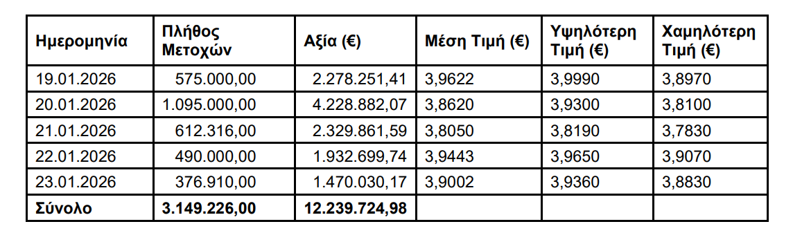 H ΑΛΦΑ ΤΡΑΠΕΖΑ (η ‘Τράπεζα’), σε συνέχεια της από 17.09.2025 ανακοίνωσής της, ενημερώνει ότι, στο Πλαίσιο του Προγράμματος Αγοράς Ιδίων Μετοχών που εγκρίθηκε με την απόφαση της Έκτακτης Γενικής Συνέλευσης των Μετόχων της με ημερομηνία 12.6.2025, κατά το διάστημα 19.01.2026 – 23.01.2026, προέβη σε αγορά μέσω του Χρηματιστηρίου Αθηνών συνολικά 3.149.226 ίδιων μετοχών, με μέση τιμή κτήσης 3,8866 € ανά μετοχή και συνολικό κόστος 12.239.724,98 €.