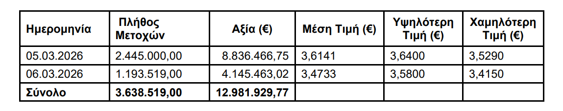 H ΑΛΦΑ ΤΡΑΠΕΖΑ (η ‘Τράπεζα’), σε συνέχεια της από 17.09.2025 ανακοίνωσής της, ενημερώνει ότι, στο Πλαίσιο του Προγράμματος Αγοράς Ιδίων Μετοχών που εγκρίθηκε με την απόφαση της Έκτακτης Γενικής Συνέλευσης των Μετόχων της με ημερομηνία 12.6.2025, κατά το διάστημα 02.03.2026 – 06.03.2026, προέβη σε αγορά μέσω του Χρηματιστηρίου Αθηνών συνολικά 3.638.519 ίδιων μετοχών, με μέση τιμή κτήσης 3,5679 € ανά μετοχή και συνολικό κόστος 12.981.929,77 €.