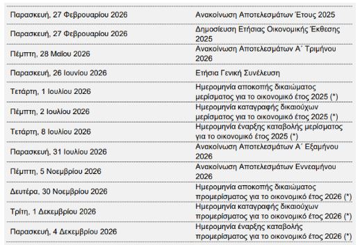(*) Οι σχετικές με την διανομή μερίσματος ανωτέρω αναφερθείσες ημερομηνίες τελούν υπό την αίρεση της έγκρισης της Τακτικής Γενικής Συνέλευσης των Μετόχων, κατόπιν σχετικής πρότασης του Διοικητικού Συμβουλίου της Εταιρείας και έγκρισης από τις αρμόδιες εποπτικές αρχές. Η διανομή του προτεινόμενου προμερίσματος και οι σχετικές ανωτέρω αναφερθείσες ημερομηνίες τελούν υπό την αίρεση των σχετικών εγκρίσεων.