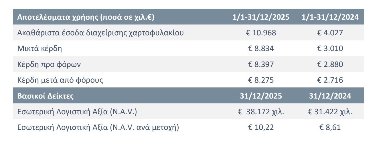 Στο τέλος του 2025, το σύνολο του χαρτοφυλακίου της Εταιρείας ήταν επενδεδυμένο στην ελληνική αγορά, με το 90,02% των επενδύσεων να αφορά εισηγμένες μετοχές στο Χρηματιστήριο Αθηνών και το υπόλοιπο να κατανέμεται κυρίως σε μετρητά και money market funds.