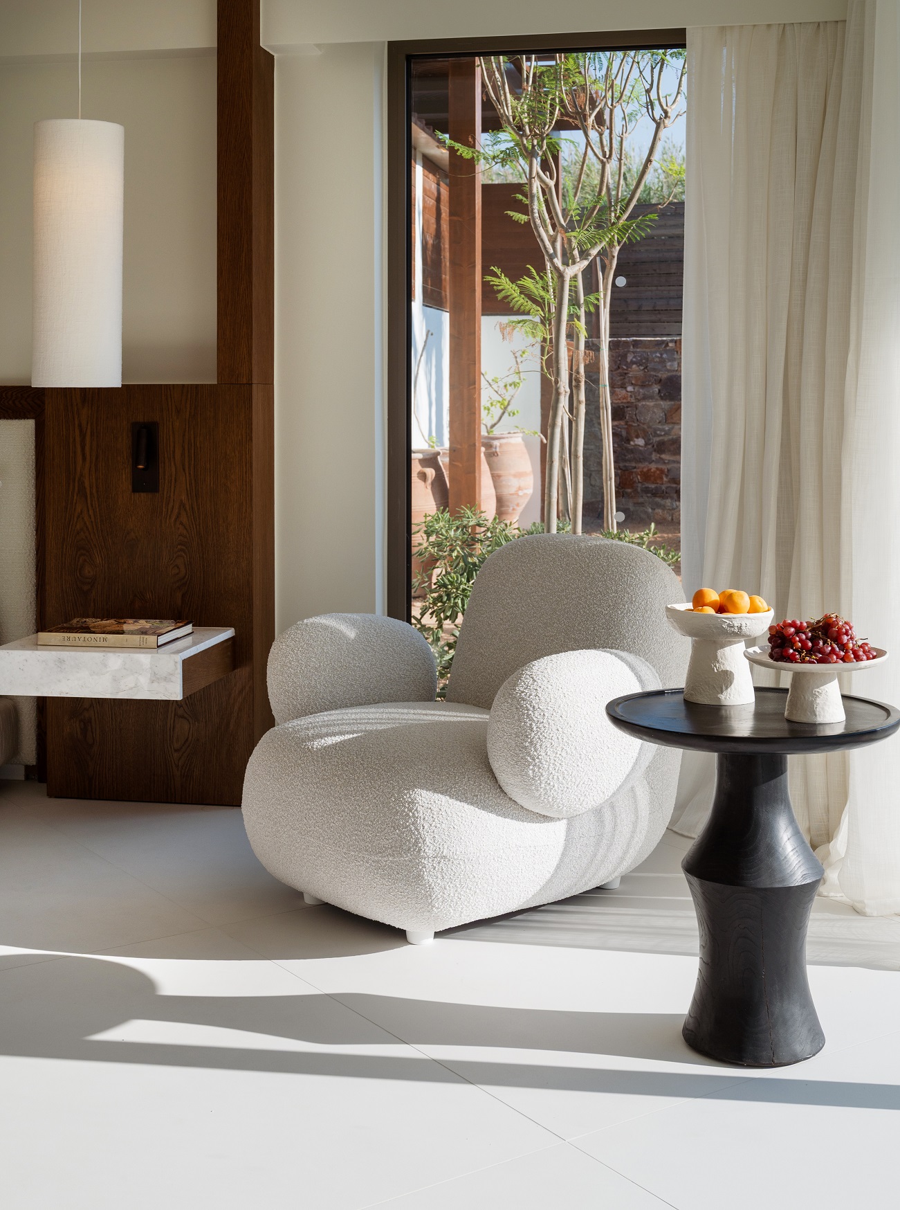 Οι φωτεινοί εσωτερικοί χώροι, οι γήινοι τόνοι και οι μεγάλες τζαμαρίες δημιουργούν μια αίσθηση προστασίας και ηρεμίας, ιδανική για χαλάρωση.