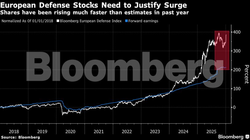 Ο αμυντικός δείκτης του Bloomberg αυξήθηκε κατά 73% το 2025, καθώς η ώθηση στις κρατικές δαπάνες τροφοδότησε το ράλι των μετοχών. Ο κλάδος έχει εξελιχθεί γρήγορα σε βασικό πυλώνα της συνολικής αγοράς, συνεισφέροντας περίπου το 12% των αποδόσεων του Stoxx Europe 600 πέρυσι, τη μεγαλύτερη συμβολή μετά τις τράπεζες.