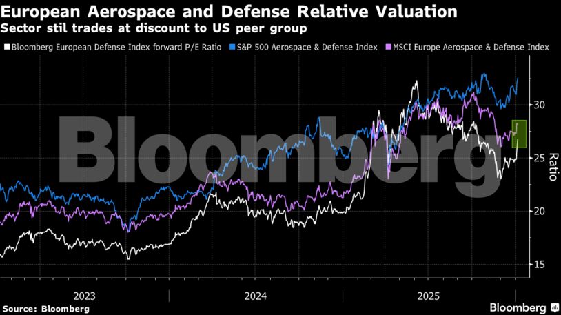 Ανάλυση του Bloomberg δείχνει ότι ο ευρύτερος ευρωπαϊκός κλάδος αεροδιαστημικής και άμυνας διαπραγματεύεται με έκπτωση σε σχέση με τον αντίστοιχο αμερικανικό, βάσει των προθεσμιακών δεικτών τιμής προς κέρδη.