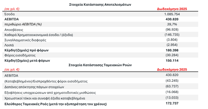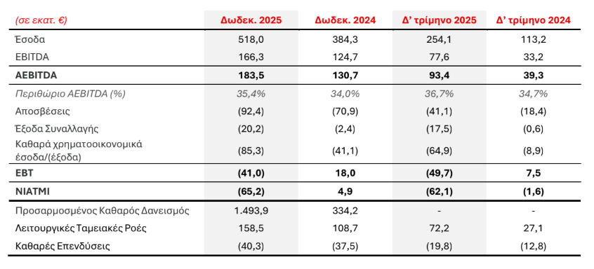• Προσαρμοσμένο EBITDA (ΑΕΒΙΤDA) για το 2025 στα €183,5 εκατ. (+40,4% σε ετήσια βάση), με το περιθώριο να διαμορφώνεται στο 35,4%.