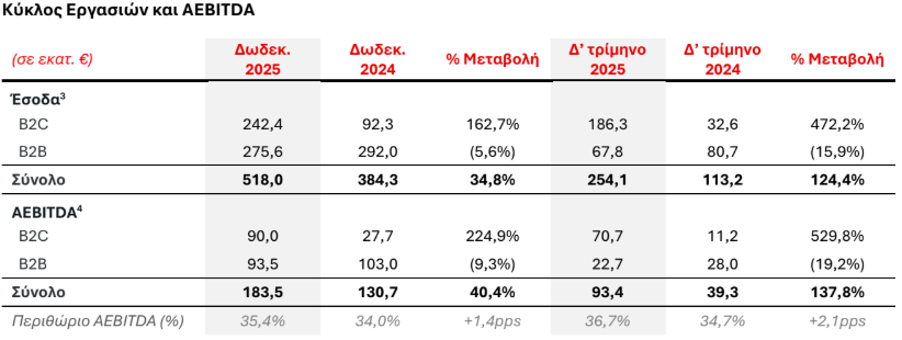 Ο ενοποιημένος κύκλος εργασιών σημείωσε αύξηση της τάξεως των €133,7 εκατ. σε σύγκριση με το δωδεκάμηνο του 2024, διαμορφώνοντας τα συνολικά έσοδα για τη δωδεκάμηνη περίοδο που έληξε την 31η Δεκεμβρίου 2025, στα €518,0 εκατ. (ή +34,8%).
