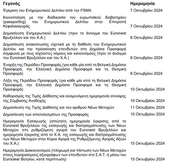 Κατωτέρω, παρατίθεται το αναμενόμενο χρονοδιάγραμμα της Προσφοράς και της εισαγωγής προς διαπραγμάτευση των Νέων Μετοχών στη ρυθμιζόμενη αγορά του Euronext Βρυξελλών και στην Κύρια Αγορά της Ρυθμιζόμενης Αγοράς Αξιών του Χ.Α.: