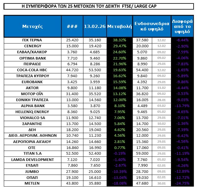 Αναμφίβολα τον πρωταγωνιστικό ρόλο στον δείκτη FTSE των μεγάλων της αγοράς το διαδραματίζει η ΓΕΚ ΤΕΡΝΑ του Γιώργου Περιστέρη, η οποία είναι και το πιο hot χαρτί της εφετινής χρονιάς. Η μετοχή τρέχει με κέρδη 38,32% ενώ από τα ενδοσυνεδριακά υψηλά της 12ης Φεβρουαρίου (37,58 ευρώ) είναι τώρα 6,44% πιο κάτω. Εξ αιτίας των έντονων πιέσεων που ασκήθηκαν στην κατακόκκινη συνεδρίαση της Παρασκευής.