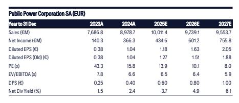 Σε ανάλυση της για την εταιρεία αναφέρει: Αναβαθμίζουμε την τιμή-στόχο μας στα 19 ευρώ ενόψει των αποτελεσμάτων γ’ τριμήνου (18/11) και της Ημέρας Επενδυτών (19/11). Αναμένουμε ανάκαμψη στο γ’ τρίμηνο, με EBITDA €647 εκατ. (+54% σε ετήσια βάση), υποστηριζόμενο από τα υψηλότερα τιμολόγια διανομής και τις βελτιωμένες συνθήκες σε ηλιακή και αιολική παραγωγή.