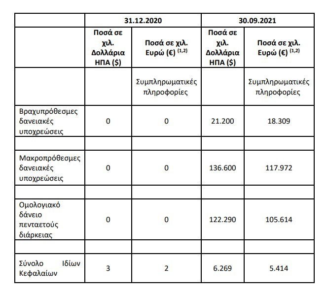 Το σύνολο των ιδίων κεφαλαίων της εταιρείας στις 30 Σεπτεμβρίου διαμορφωνόταν στα 5,41 εκατ. ευρώ.