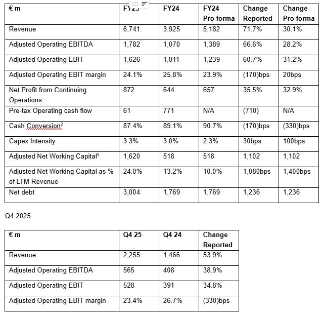Όπως είχε γνωστοποιηθεί κατά τη διάρκεια της αρχικής δημόσιας προσφοράς, τα έσοδα για το οικονομικό έτος 2026 αναμένεται να διαμορφωθούν μεταξύ €7,4 και €7,6 δισ, με το προσαρμοσμένο λειτουργικό περιθώριο EBIT να παραμένει σταθερά στο 24-25%. Οι κεφαλαιουχικές δαπάνες εκτιμάται ότι θα αυξηθούν στο 8,5% των εσόδων, ενώ το καθαρό κεφάλαιο κίνησης προβλέπεται να μειωθεί περαιτέρω κάτω από το 20% των εσόδων.