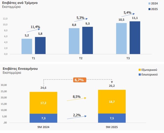 Η επιβατική κίνηση το εννεάμηνο του 2025 ανήλθε σε 26,1 εκατ. επιβάτες, αυξημένη 6,7% σε σχέση με το εννεάμηνο του 2024, ενώ τα συνολικά έσοδα και λοιπά εισοδήματα αυξήθηκαν κατά 3,5% σε 526,9 εκατ. ευρώ, κυρίως λόγω της αύξησης της επιβατικής κίνησης και της αναπροσαρμογής των τελών αεροδρομίου σύμφωνα με το ρυθμιστικό πλαίσιο, σύμφωνα με την ανακοίνωση του Διεθνούς Αερολιμένα Αθηνών για την εννεάμηνη περίοδο που έληξε στις 30 Σεπτεμβρίου 2025.