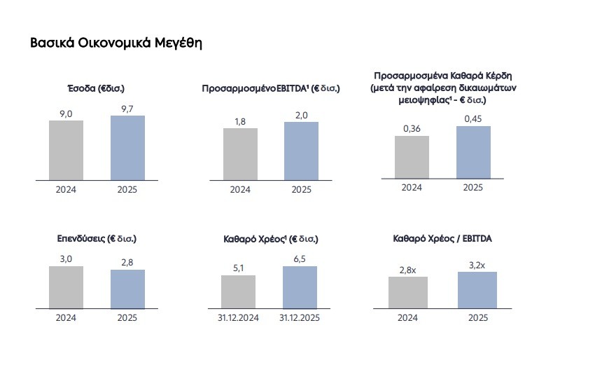 Ο δείκτης Καθαρό Χρέος/EBITDA διαμορφώθηκε σε 3,2x, αντανακλώντας το υψηλότερο επίπεδο επενδύσεων, παραμένοντας ωστόσο κάτω από το όριο του 3,5x που έχει θέσει ο Όμιλος ως ανώτατο όριο στο πλαίσιο της χρηματοοικονομικής πολιτικής του, με τον καθαρό δανεισμό να διαμορφώνεται σε €6,5 δισ. στις 31.12.2025.