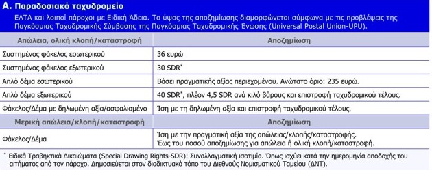 Σύμφωνα με τον νέο κανονισμό, για ΕΛΤΑ και παραδοσιακά ταχυδρομεία, για απώλεια/ολική κλοπή και καταστροφή απλού συστημένου φακέλου εσωτερικού, η αποζημίωση ανέρχεται στα 36 ευρώ. Για απλό δέμα εσωτερικού, η αποζημίωση καθορίζεται βάσει της πραγματικής αξίας του δέματος, με ανώτατο όριο τα 235 ευρώ.