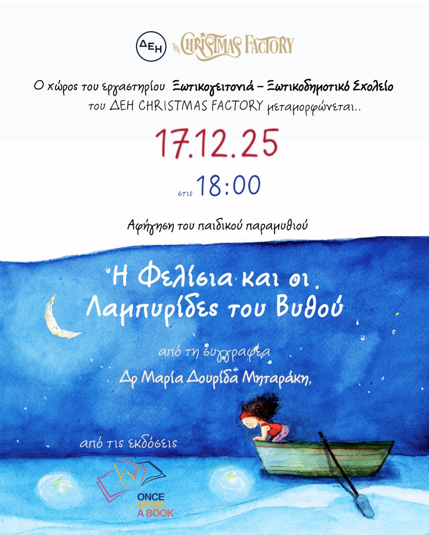 Στην Ξωτικογειτονιά – Ξωτικοδημοτικό Σχολείο το παραμύθι ζωντανεύει και έρχεται να προσθέσει λίγη ακόμη μαγεία, την Τετάρτη 17 Δεκεμβρίου, στις 18:00, μέσα σε αυτό το γιορτινό σκηνικό. Οι Εκδόσεις Once Upon a Book προσκαλούν μικρούς και μεγάλους σε μια παραμυθένια αφήγηση του βιβλίου «Η Φελίσια και οι λαμπυρίδες του βυθού» από τη συγγραφέα Μαρία Δουρίδα Μηταράκη. Μέσα από τη ζωντανή αφήγηση και τη φαντασμαγορική ατμόσφαιρα, μικροί και μεγάλοι επισκέπτες θα ταξιδέψουν και θα γνωρίσουν τον μαγικό κόσμο της Φελίσιας, θα ανακαλύψουν τις φωτεινές λαμπυρίδες και θα συνδεθούν με φως και δύναμη.