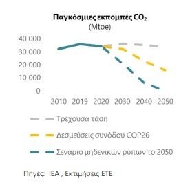 Στην πρόσφατη διάσκεψη COP26, ενώ σημειώθηκαν βήματα προς τη σωστή κατεύθυνση (όπως η αναφορά για πρώτη φορά στην απανθρακοποίηση), οι επιτευχθείσες συμφωνίες υστερούν σε σαφήνεια βραχυπρόθεσμων δεσμεύσεων και καλύπτουν περίπου το 1/2 του επιθυμητού στόχου για καθαρό μηδενισμό εκπομπών μέχρι το 2050. Πέρα από το υψηλό επενδυτικό κόστος, η δυσκολία του εγχειρήματος έγκειται στην επιτυχή αντιμετώπιση δυο προκλήσεων: