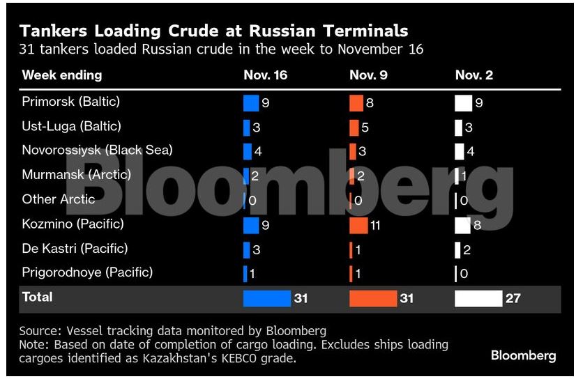 Τουλάχιστον 11 τέτοια πλοία περιμένουν να εκφορτώσουν φορτία, με την προθεσμία της 21ης Νοεμβρίου που έχουν ορίσει οι ΗΠΑ για τον τερματισμό των συναλλαγών με την Rosneft και την Lukoil να πλησιάζει.
