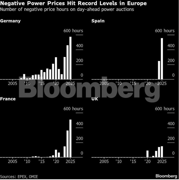 Μάλιστα, η Γερμανία κατέγραψε 573 ώρες αρνητικών τιμών το 2025, αύξηση 25% σε σχέση με το προηγούμενο έτος, ενώ η Ισπανία, η οποία κατέγραψε αρνητικές τιμές για πρώτη φορά το 2024, από τότε τις έχει δει να διπλασιάζονται σε ετήσια βάση.