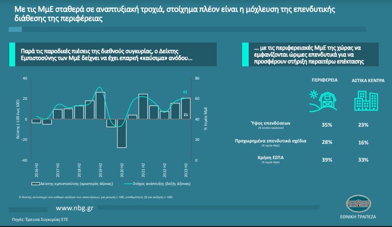 Υπό αυτή την οπτική, η Διεύθυνση Οικονομικής Ανάλυσης της ΕΤΕ, αξιοποιώντας την τακτική έρευνα πεδίου της στις ΜμΕ, επιβεβαίωσε την ανθεκτικότητα του τομέα σε όρους πορείας του Δείκτη Εμπιστοσύνης και προσδοκιών των επιχειρήσεων για το 2024.