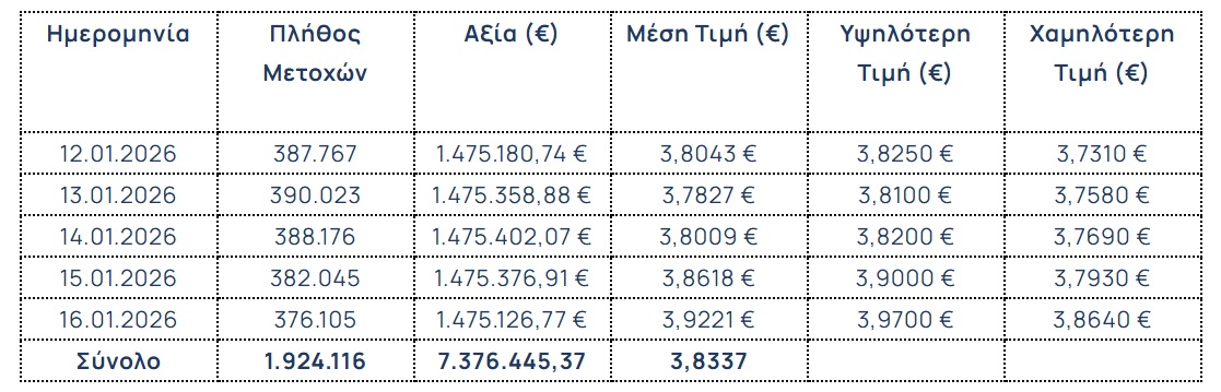 Η «Τράπεζα Eurobank Ανώνυμη Εταιρεία» (εφεξής η «Eurobank» ή η «Τράπεζα»), σε συνέχεια της από 12.12.2025 ανακοίνωσής της σχετικά με την έναρξη εφαρμογής του Προγράμματος Επαναγοράς Ιδίων Μετοχών («Πρόγραμμα»), το οποίο εγκρίθηκε με την απόφαση της Έκτακτης Γενικής Συνέλευσης των Μετόχων της Τράπεζας στις 22.10.2025, σύμφωνα με το άρθρο 49 του ν. 4548/2018, σε συνέχεια του αντίστοιχου προγράμματος της «Eurobank Ergasias Υπηρεσιών και Συμμετοχών Ανώνυμη Εταιρεία» («Eurobank Holdings») που θεσπίστηκε με την απόφαση της από 30.04.2025 Τακτικής Γενικής Συνέλευσης των Μετόχων της τελευταίας, και σε συνέχεια της από 22.10.2025 απόφασης του Διοικητικού Συμβουλίου της, ενημερώνει το κοινό ότι κατά το διάστημα 12.01.2026 – 16.01.2026 απέκτησε συνολικά, στο πλαίσιο του Προγράμματος, 1.924.116 μετοχές εκδόσεως της ιδίας («Ίδιες Μετοχές») που διαπραγματεύονται στο Χρηματιστήριο Αθηνών («Χ.Α.»), με μέση τιμή κτήσης €3,8337 ανά μετοχή και συνολικό κόστος €7.376.445,37.