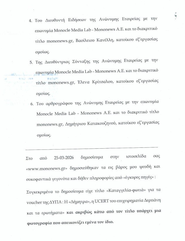 Την 25.3.2026 αναρτήσαμε άρθρο με τίτλο: «Καταγγελία -φωτιά για τα voucher της ΔΥΠΑ: Η «Δήμητρα», η Ucert του επιχειρηματία Δερπάνη και τα ερωτήματα». Το δημοσίευμα στηρίχτηκε σε καταγγελία που ήρθε σε γνώση μας από δημοσιογραφικές πηγές και θεωρήσαμε χρέος μας να ενημερώσουμε για αυτό το αναγνωστικό κοινό.