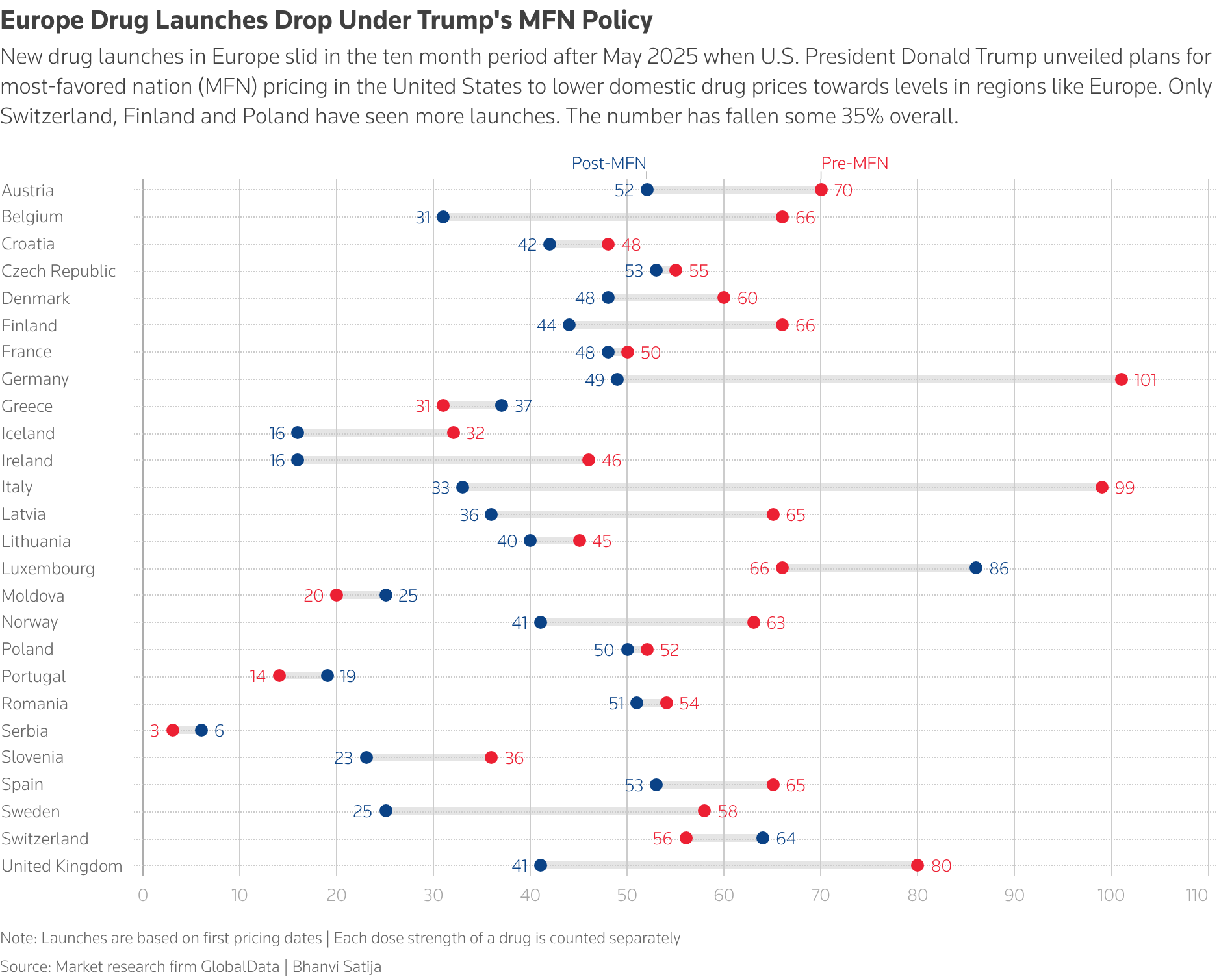 Σύμφωνα με την GlobalData, οι νέες κυκλοφορίες φαρμάκων στην Ευρώπη μειώθηκαν κατά περίπου 35% στους 10 μήνες μετά την εισαγωγή της διεθνούς αναφοράς τιμών στις ΗΠΑ τον Μάιο, σε σύγκριση με τους 10 προηγούμενους μήνες. Η αναβολή της κυκλοφορίας σε χαμηλότερες τιμές στην ΕΕ θα μπορούσε να βοηθήσει στη διατήρηση υψηλότερων τιμών στις ΗΠΑ για μεγαλύτερο χρονικό διάστημα.