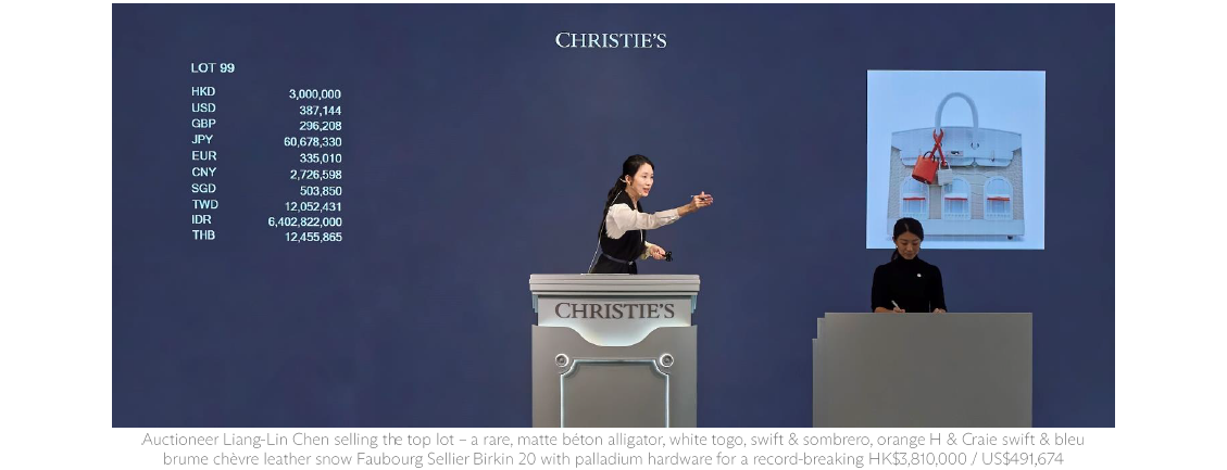 Ο οίκος δημοπρασιών Christie’s σημείωσε νέο ιστορικό ορόσημο στην κατηγορία τσαντών πολυτελείας καθώς η φθινοπωρινή ζωντανή δημοπρασία στο Χονγκ Κονγκ, που πραγματοποιήθηκε στις 24 Νοεμβρίου, έκλεισε με συνολικά έσοδα 8 εκατομμύρια δολάρια, καταγράφοντας το υψηλότερο αποτέλεσμα για την κατηγορία στην Ασία.