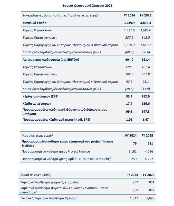 2025 και ανήλθαν σε 3.855,4 εκατ. ευρώ. Ταυτόχρονα, η λειτουργική κερδοφορία (adj. EBITDA) του Ομίλου αυξήθηκε κατά 56,3%, φθάνοντας τα 631,4 εκατ. ευρώ.