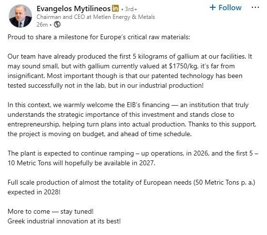 Η Metlen στοχεύει πλέον να διαδραματίσει βασικό ρόλο στον εφοδιασμό της Ευρωπαϊκής Ένωσης με γάλλιο.