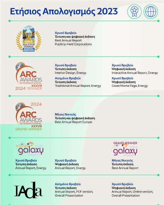 Σημαντικές οι φετινές διακρίσεις σε διεθνείς διαγωνισμούς για τον Ετήσιο Απολογισμό της HELLENiQ ENERGY για το 2023, ο οποίος κατέκτησε 9 βραβεία ως «Καλύτερος Ετήσιος Απολογισμός», καθώς και, για πρώτη φορά, τη διάκριση «Μέγας Νικητής – Καλύτερος Ετήσιος Απολογισμός, Ευρώπη*».