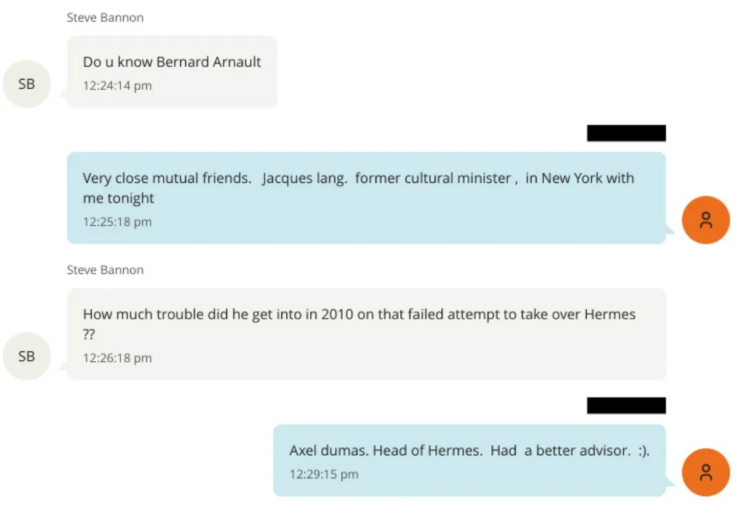 Σε μηνύματα, ο Steve Bannon φαίνεται να παρουσιάζει την αποτυχημένη προσπάθεια του Bernard Arnault να εξαγοράσει τον οίκο ως κάτι δεδομένο και κοινώς γνωστό. Στην ίδια επικοινωνία, ο Διευθύνων Σύμβουλος της Hermès παρουσιάζεται ως ο νικητής της υπόθεσης.