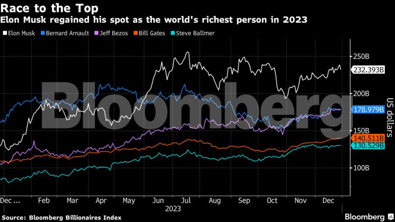 Ένα εντυπωσιακό comeback σημείωσαν οι 500 πλουσιότεροι του κόσμου το 2023, με την συνολική καθαρή περιουσία τους να αυξάνεται κατά 1,5 τρισεκατομμύρια δολάρια, αντιστρέφοντας πλήρως τις ζημιές ύψους 1,4 τρισ. δολαρίων που είχαν σημειώσει το 2022, σύμφωνα με τον Δείκτη Δισεκατομμυριούχων του Bloomberg.