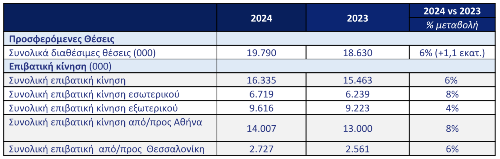 Συνολικά το 2024 η AEGEAN μετέφερε 16,3 εκατ. επιβάτες, καταγράφοντας για το 2024 ετήσια αύξηση 6% σε σχέση με το 2023, έχοντας προσφέρει περισσότερες από 19,7 εκατ. θέσεις, αυξημένες κατά 1,1 εκατ. παρά τις επιχειρησιακές και γεωπολιτικές προκλήσεις και κατέγραψε ένα ακόμη, νέο ιστορικό υψηλό στην επιβατική κίνηση της εταιρείας.