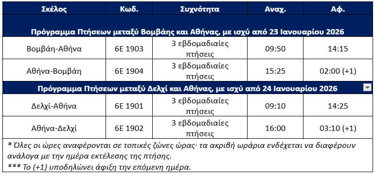 Πρόγραμμα πτήσεων μεταξύ Βομβάης / Δελχί και Αθήνας, με ισχύ από 23 Ιανουαρίου 2026