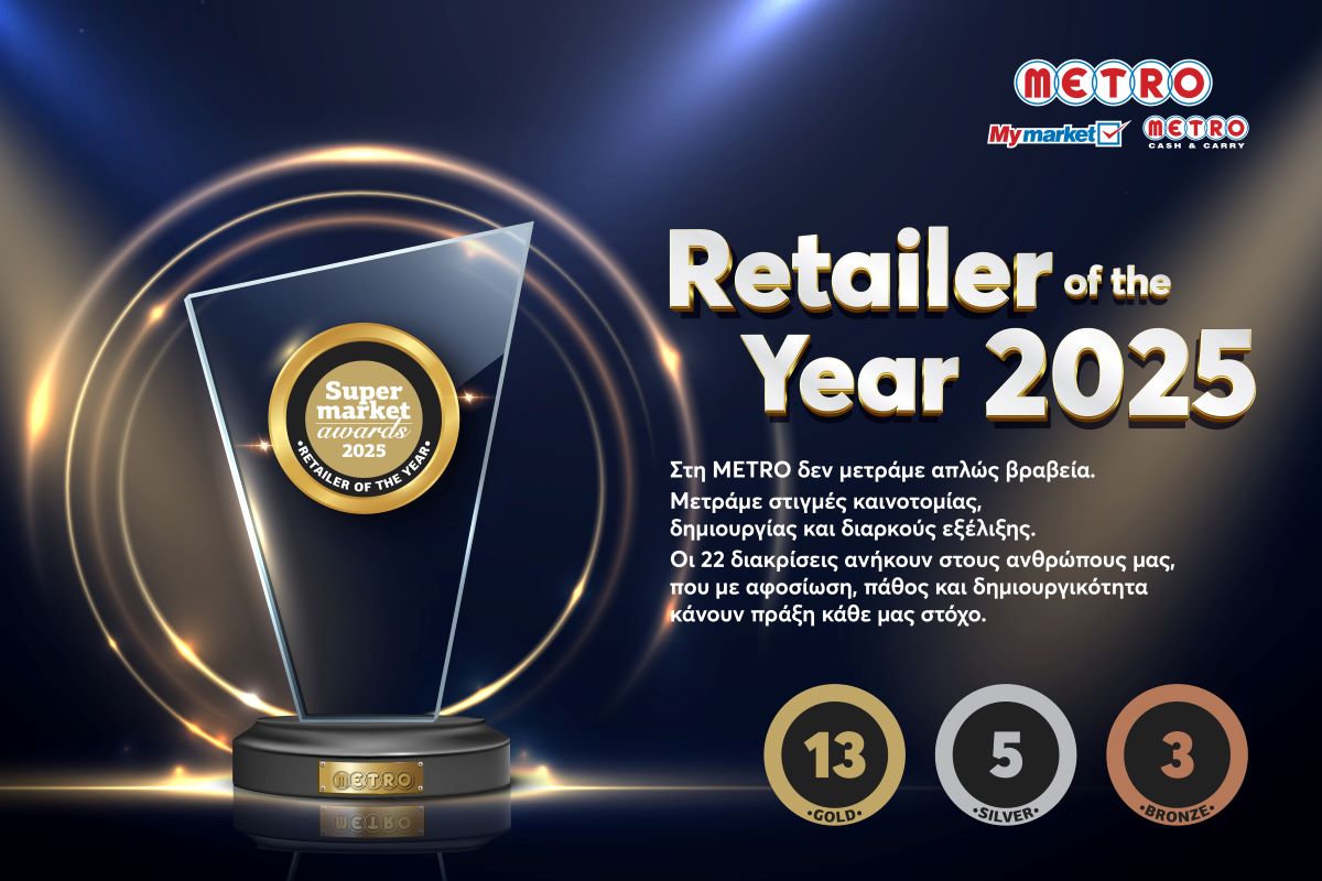 Η METRO με το δίκτυο καταστημάτων My market και METRO Cash & Carry, αναδείχθηκε Retailer of the Year 2025 στα Supermarket Awards, αποσπώντας την κορυφαία διάκριση του θεσμού. Η σημαντική αυτή αναγνώριση επιβεβαιώνει τη σταθερή δέσμευση της εταιρείας στην ποιότητα, τη βιωσιμότητα, την καινοτομία, την αναβαθμισμένη παροχή υπηρεσιών σε όλα τα επίπεδα και την αριστεία σε κάθε πτυχή της δραστηριότητάς της.