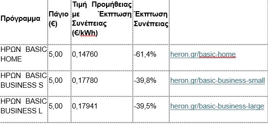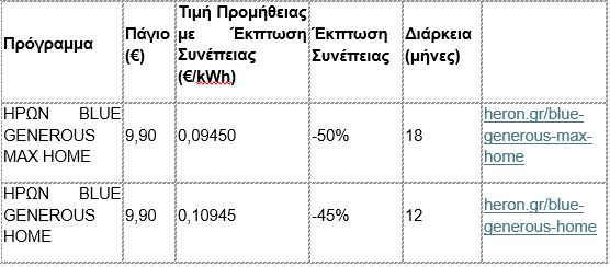 Εξάλλου, οι τιμές των σταθερών οικιακών προγραμμάτων HΡΩΝ ΒLUE GENEROUS, παραμένουν πολύ ανταγωνιστικές, καθώς με το 18μηνης διάρκειας συμβόλαιο ΗΡΩΝ BLUE GENEROUS MAX διαμορφώνονται χαμηλότερα από τα 9,5 λεπτά ανά κιλοβατώρα. Ως εκ τούτου, η τιμή παραμένει χαμηλή και σταθερή έως κι ολόκληρο τον επόμενο χειμώνα.