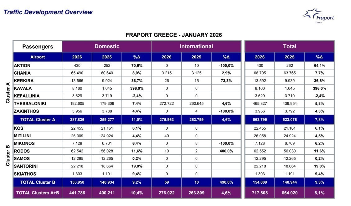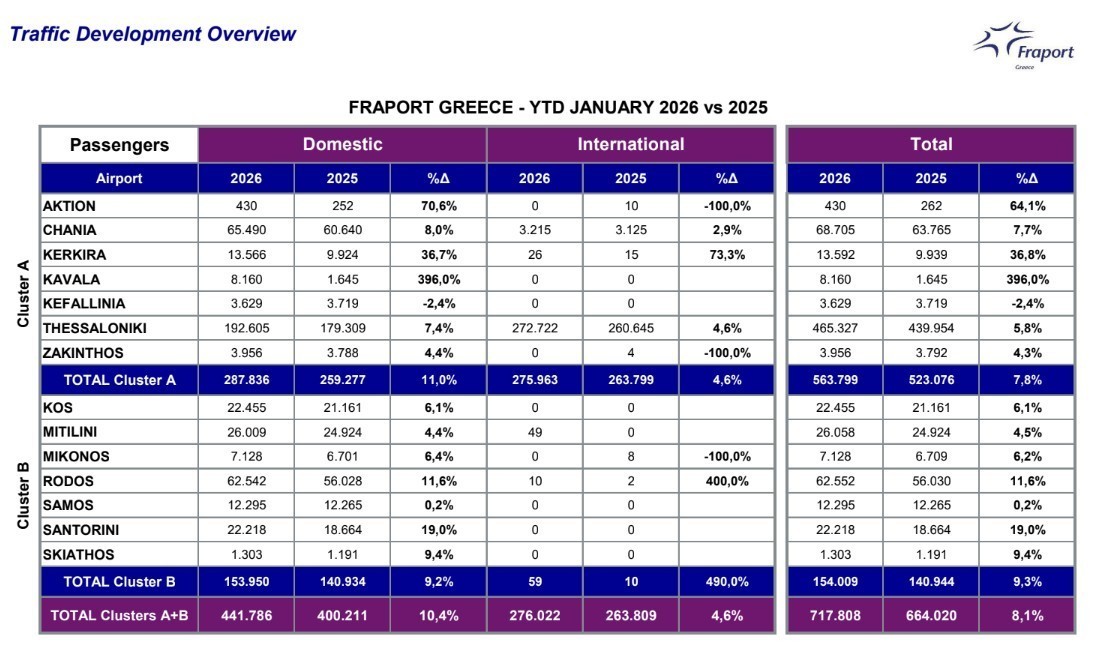 Αυξημένη κατά 8,1% διαμορφώθηκε η επιβατική κίνηση στα 14 περιφερειακά αεροδρόμια που διαχειρίζεται η Fraport Greece τον Ιανουάριο του 2026, με το σύνολο των ταξιδιωτών να φθάνει τις 718.000.
