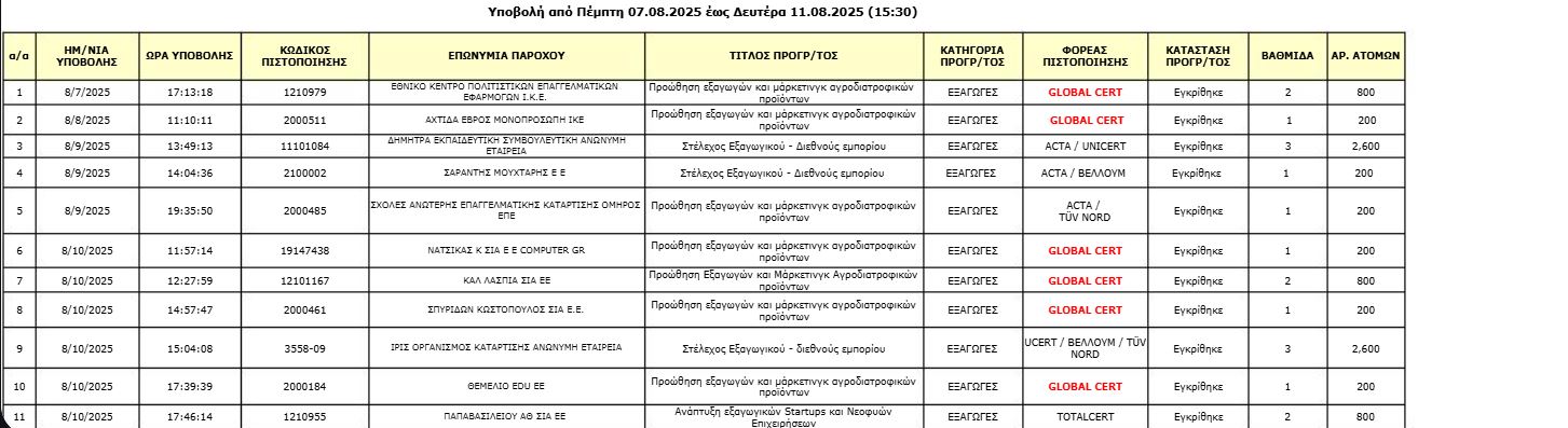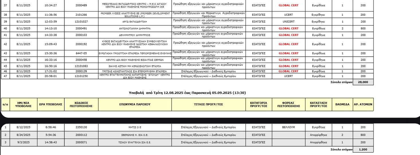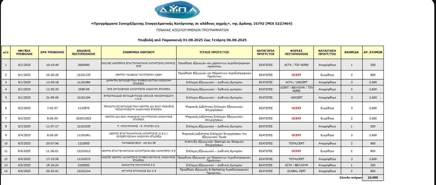Κατά την πρώτη φάση αξιολόγησης (1–6 Αυγούστου 2025), στον κλάδο των εξαγωγών υποβλήθηκαν 14 προγράμματα. Από αυτά εγκρίθηκαν 5, με συνολική δυναμικότητα 7.600 ωφελούμενων, αριθμός που προσεγγίζει το ανώτατο όριο των διαθέσιμων θέσεων. Από το Αναλυτικά, στο σύνολο των 67 υποβληθέντων προγραμμάτων στους κλάδους Αιχμής, τα: