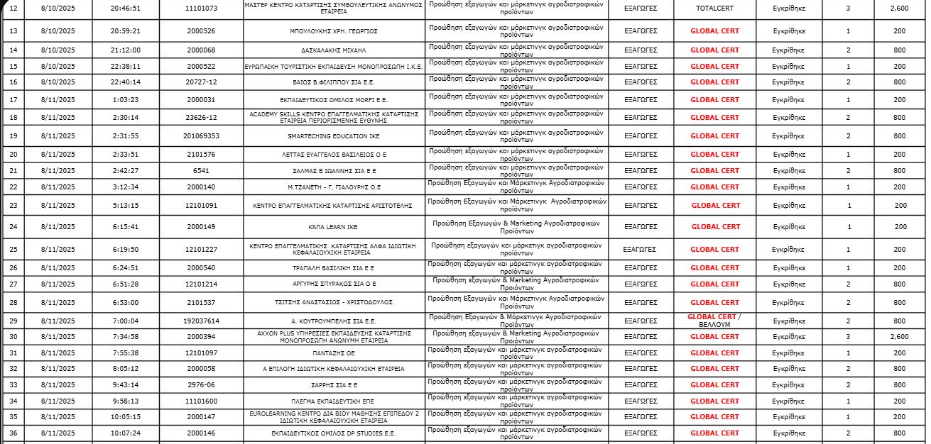 Συγκεκριμένα, έφεραν τον ίδιο τίτλο («Προώθηση εξαγωγών και μάρκετινγκ αγροδιατροφικών προϊόντων») και όλα, σύμφωνα με τον καταγγέλλοντα, αυτά τα προγράμματα συνδέονταν με τον ίδιο φορέα πιστοποίησης, την CLOBAL CERT.
